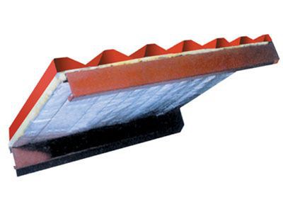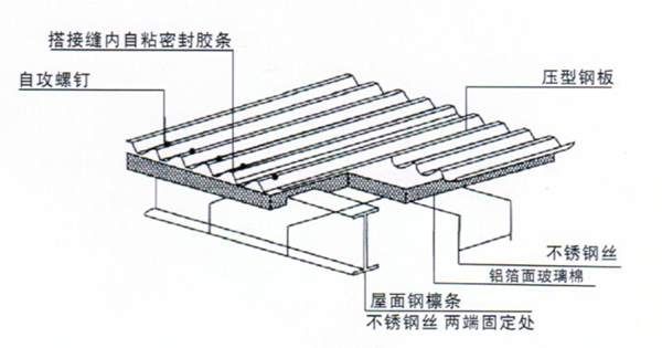 掛網式玻璃棉夾芯屋面板構成玻璃絲綿夾芯板室上下兩層彩色壓型板通過龍骨和玻璃絲綿組合而成。
