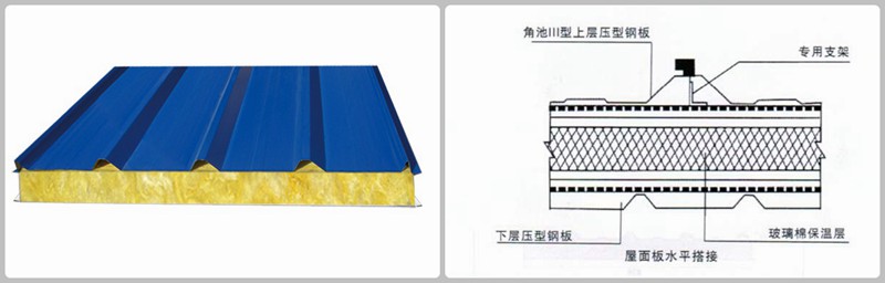 新疆彩鋼玻璃棉夾芯屋面板構(gòu)成玻璃絲綿夾芯板室上下兩層彩色壓型板通過(guò)龍骨和玻璃絲綿組合而成。