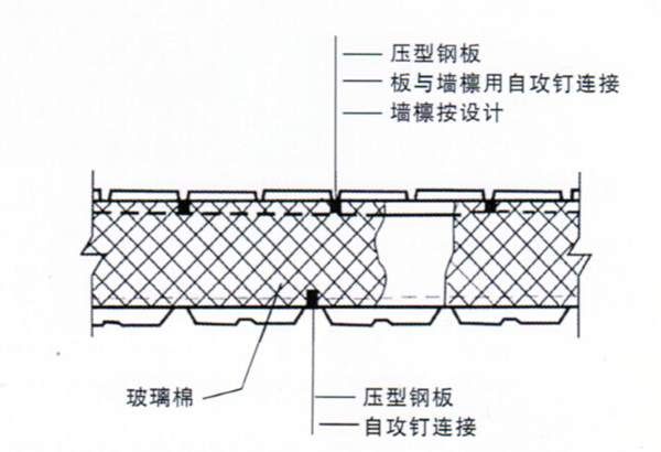 新疆彩鋼玻璃絲棉夾芯墻面板構(gòu)成玻璃絲綿夾芯板室上下兩層彩色壓型板通過龍骨和玻璃絲綿組合而成。